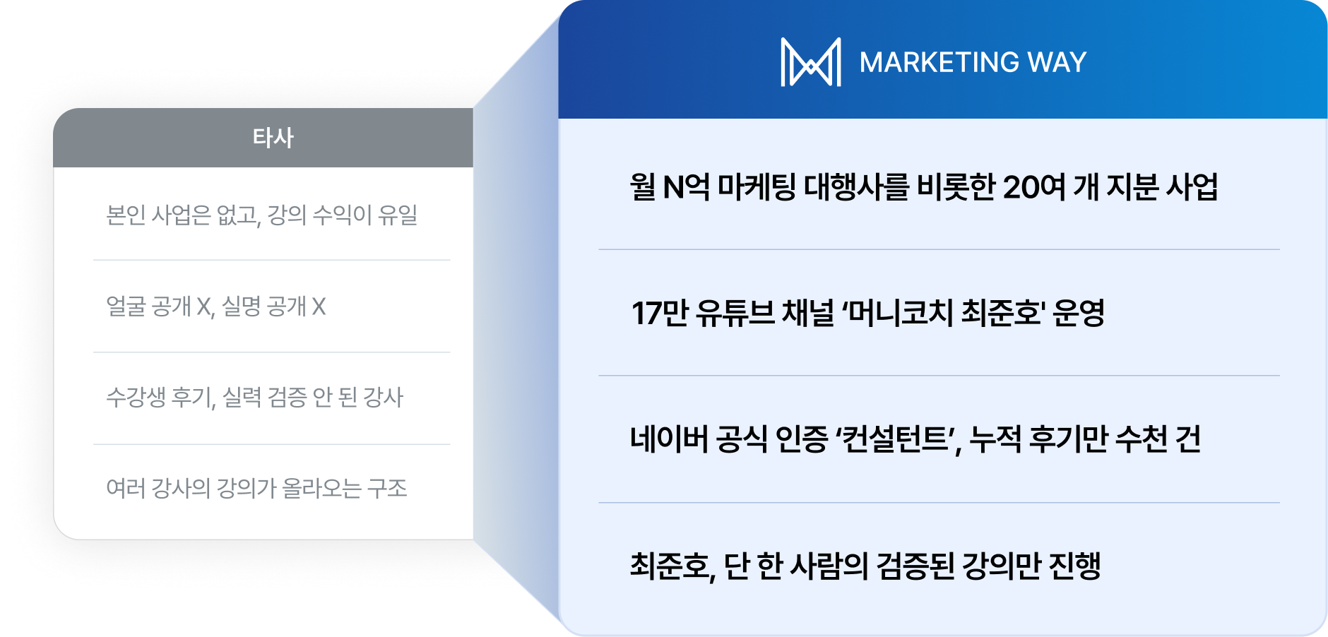 1위에게 배우세요.더이상의 시간 낭비는 없습니다.네, 제가 바로 '머니코치 최준호'입니다. 지난 수년 간 수천 명의 삶을 변화시켰습니다.Fast, More Fast마케팅에도 지름길은 있습니다.시행착오 없이, 가장 빠르고 확실한 성과를 약속드립니다. 1위에게 배우세요.더이상의 시간 낭비는 없습니다.네, 제가 바로 '머니코치 최준호'입니다. 지난 수년 간 수천 명의 삶을 변화시켰습니다.Fast, More Fast마케팅에도 지름길은 있습니다.시행착오 없이, 가장 빠르고 확실한성과를 약속드립니다. 1위에게 배우세요.더이상의 시간 낭비는 없습니다. 네, 제가 바로 ‘머니코치 최준호’입니다.지난 5년 간 수백 명의 삶을 변화시켰습니다. NAVER·MARKETING·PLACE·CAFE·CONSULTING·NAVER·MARKETING·PLACE·CAFE·CONSULTING·NAVER·MARKETING·PLACE·CAFE·CONSULTING·NAVER·MARKETING·PLACE·CAFE·CONSULTING·NAVER·MARKETING·PLACE·CAFE·CONSULTING·NAVER·MARKETING·PLACE·CAFE·CONSULTING·NAVER·MARKETING·PLACE·CAFE·CONSULTING·NAVER·MARKETING·PLACE·CAFE·CONSULTING·NAVER·MARKETING·PLACE·CAFE·CONSULTING·NAVER·MARKETING·PLACE·CAFE·CONSULTING·NAVER·MARKETING·PLACE·CAFE·CONSULTING·NAVER·MARKETING·PLACE·CAFE·CONSULTING·NAVER·MARKETING·PLACE·CAFE·CONSULTING·NAVER·MARKETING·PLACE·CAFE·CONSULTING·NAVER·MARKETING·PLACE·CAFE·CONSULTING·NAVER·MARKETING·PLACE·CAFE·CONSULTING·NAVER·MARKETING·PLACE·CAFE·CONSULTING·NAVER·MARKETING·PLACE·CAFE·CONSULTING·NAVER·MARKETING·PLACE·CAFE·CONSULTING·NAVER·MARKETING·PLACE·CAFE·CONSULTING·NAVER·MARKETING·PLACE·CAFE·CONSULTING 강의 전자책 컨설팅 후기모음 칼럼 문의하기 마케팅웨이는 다릅니다. 타사와 마케팅웨이의 압도적인 차별점을 비교해 보세요. 타사와 마케팅웨이의 압도적인 차별점을비교해 보세요. 강의로만 먹고 사는 어중이떠중이? 매달 최소 1억 매출 마케팅 대행사 운영 철지난 지식을 우려먹는 강의 팔이와 다릅니다.저는 현재도 온라인 마케팅 대행사를 직접 운영하며최소 월 1억 원 이상의 매출을 꾸준히 내고 있습니다. 철지난 지식을 우려먹는 강의 팔이와다릅니다.저는 현재도 온라인 마케팅 대행사를 직접 운영하며 최소 월 1억 원 이상의매출을 꾸준히 내고 있습니다. 직접 운영은 안 해본 거 아니야? 20여 개의 지분 사업으로 업종별 실전 지식까지 저는 온라인 마케팅 능력, 이 단 하나만 가지고애견 카페, 입시 컨설팅, 각종 전문직을 포함한20여 개 다양한 업종의 지분사업을 하고 있습니다. 얼굴 · 실명 공개 X 실체 없는 강사? 17만 유튜브 채널 ‘머니코치 최준호’ 운영 저는 얼굴 공개하고, 실명 다 까고 승부합니다.온라인 마케팅 노하우를 무료로 나누고 있습니다.마케터들도 제 유튜브로 최신 로직을 공부합니다. 저는 얼굴 공개하고, 실명 다 까고 승부합니다.온라인 마케팅 노하우를 무료로나누고 있습니다.마케터들도 제 유튜브로 최신 로직을공부합니다. 실력이 검증된 거 맞나요? 네이버 인증 ‘컨설턴트’ 네이버 마케팅 저서 기술 온라인 마케팅 전문가라는 수천 명의 사람들 중 최초로,‘마케터, 컨설턴트’로 네이버에게 인정받은 유일한 강사이며공신된 실력으로 ‘네이버 3대장 마케팅’ 저서를베스트 셀러에 올렸습니다. 온라인 마케팅 전문가라는수천 명의 사람들 중 최초로,‘마케터, 컨설턴트’로 네이버에게인정받은 유일한 강사이며공신된 실력으로 ‘네이버 3대장 마케팅’저서를 베스트 셀러에 올렸습니다. 마케팅웨이에서만 만날 수 있는 BEST 상품 결제부터 하지 마세요. 유튜브부터 보세요. 유료 강의급 지식이 모두 무료입니다. 무료 영상 더 보기 만족도율 4.9 마케팅웨이를 경험한 수많은 분들의 후기 결제부터 하지 마세요. 무료 정보들부터 충분히 둘러보세요. 무료 칼럼보러 가기 최준호 유튜브보러 가기 무료 강의보러 가기 ‘결국은 마케팅웨이’ 온라인에서의 성공은 여기서부터 언제 시작하든, 마케팅웨이와 함께라면 ‘빠르게’ 효과봅니다. 언제 시작하든, 마케팅웨이와 함께라면‘빠르게’ 효과봅니다.