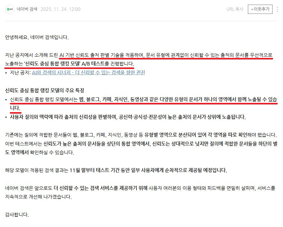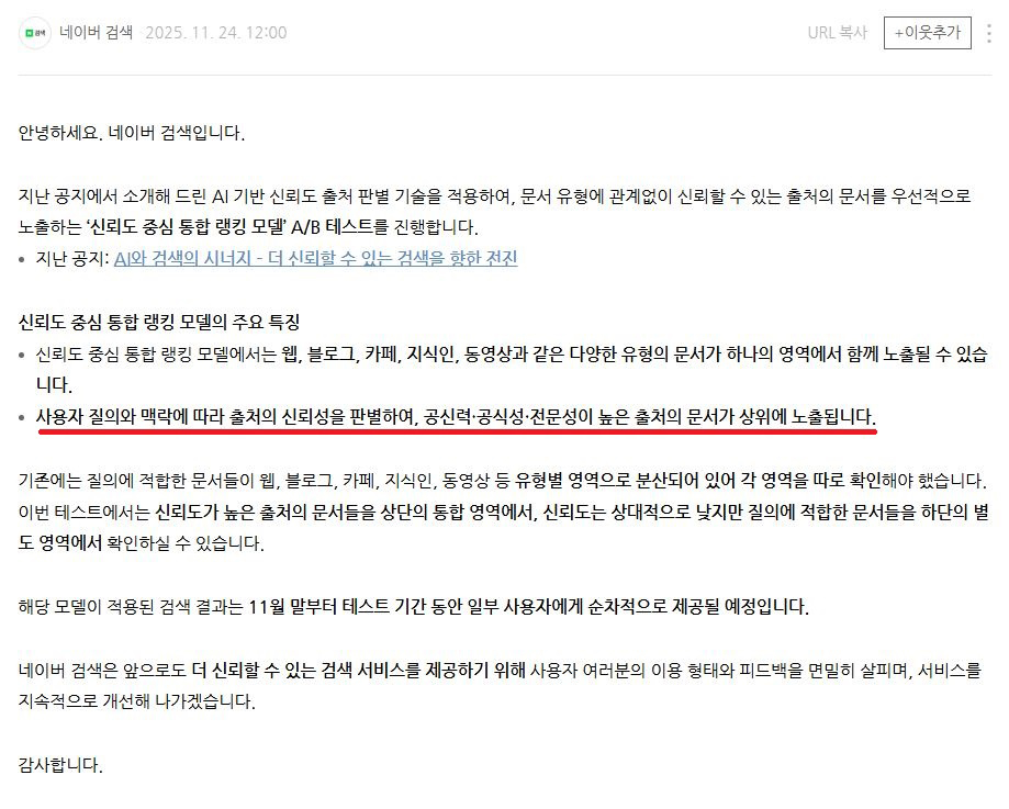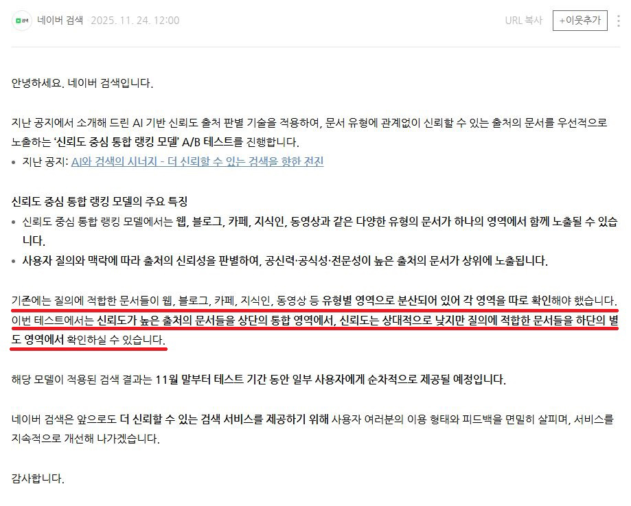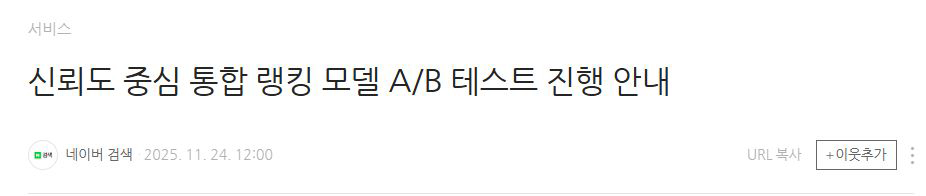 네이버가 공지를 냈습니다. 제목부터 거창합니다. ‘신뢰도 중심 통합 랭킹 모델 A/B 테스트 진행.’