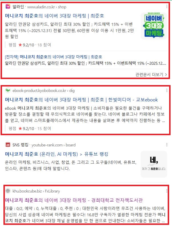 보이시죠? 이게 바로 네이버가 공지에서 말한 ‘신뢰도 중심 통합 랭킹 모델’의 베타 버전입니다. 제가 네이버 마케팅 쪽으로는 워낙 오랫동안 활동했고, 책도 베스트셀러에 인지도도 있다 보니까 네이버가 제 키워드, 제 이름을 가지고 테스트를 돌리고 있는 것 같습니다.
