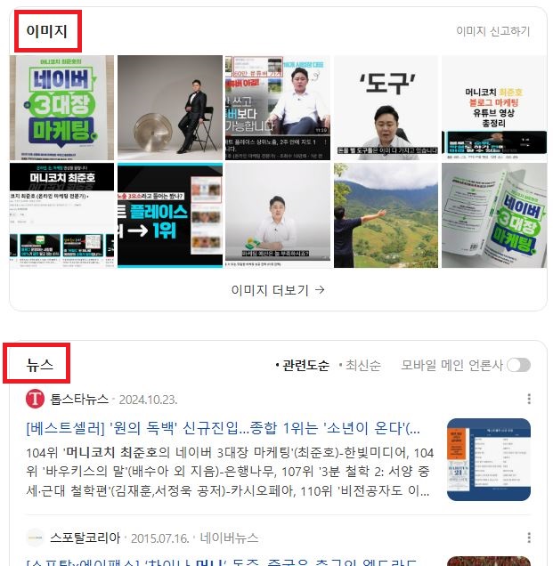 더 아래로 내리면 이제서야 이미지 탭, 뉴스 탭, 도서 탭 같은 ‘별도 영역’이 나오기 시작합니다.