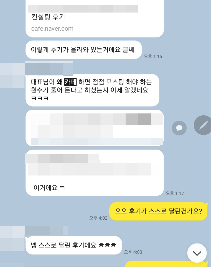 이제부터 실제 제가 조르고 졸라서 카페 시작하라고 했던 분들의 후기를 보여드리겠습니다. 다 읽지는 못하고 살짝 요점 정리만 하면서 지나갈 예정이니 궁금하신 분들은 일시정지하면서 봐주세요.
