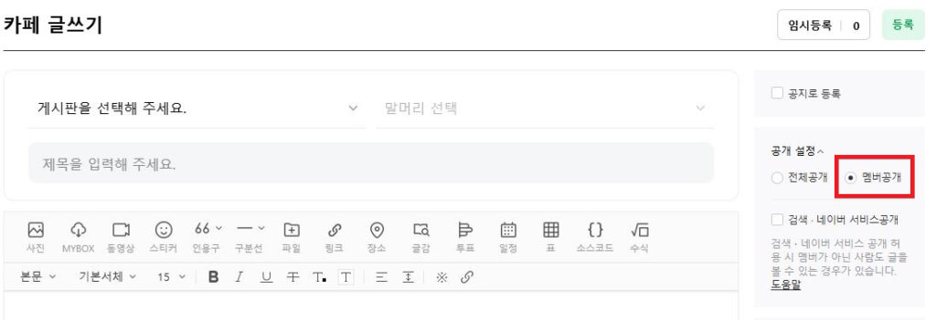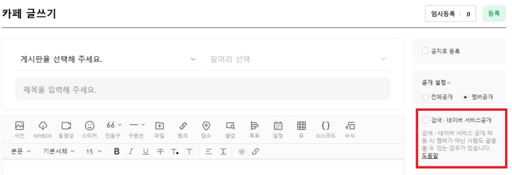 첫째, 네이버에 검색이 안 되게 ‘검색 비허용’으로 설정해야 됩니다. 이건 상위 노출을 시키는 글이 아니라, 내 카페에서만 볼 수 있는 글이어야 되기 때문입니다.