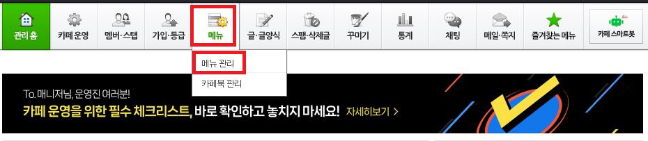 그리고 ‘메뉴’ -> ‘메뉴 관리’를 클릭하면