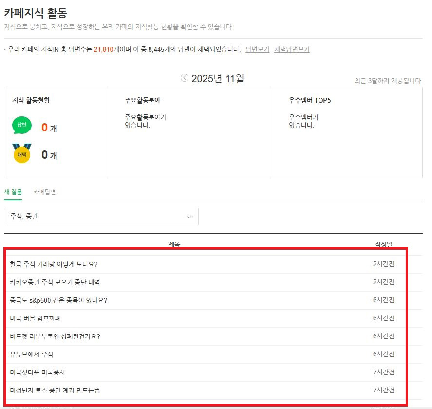 이 카페 지식 활동 카테고리를 누르면 내가 설정한 테마에 대한 질문이 지식인에 올라올 때마다 이 카테고리에 그 질문이 쌓입니다. 그리고 이 카페에서 이 질문에 대한 답변을 하면