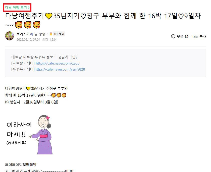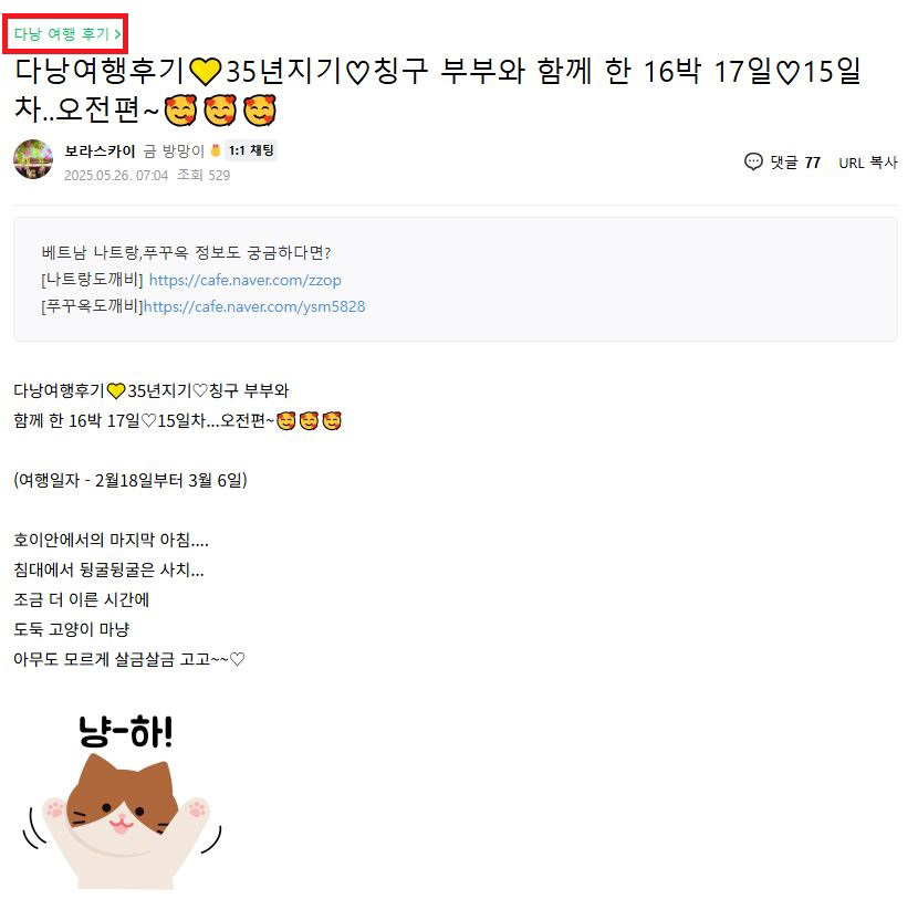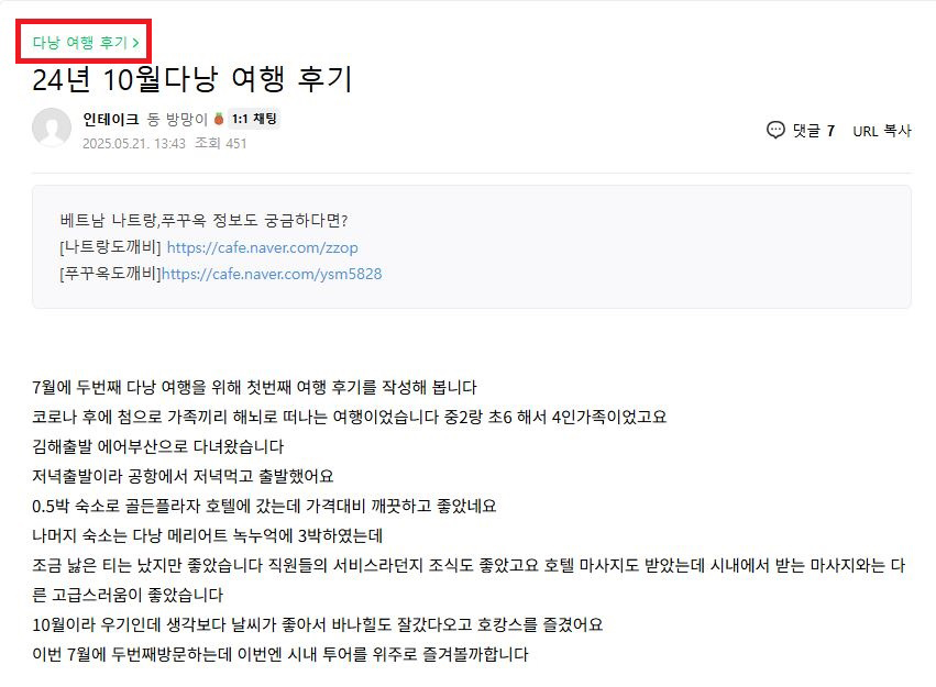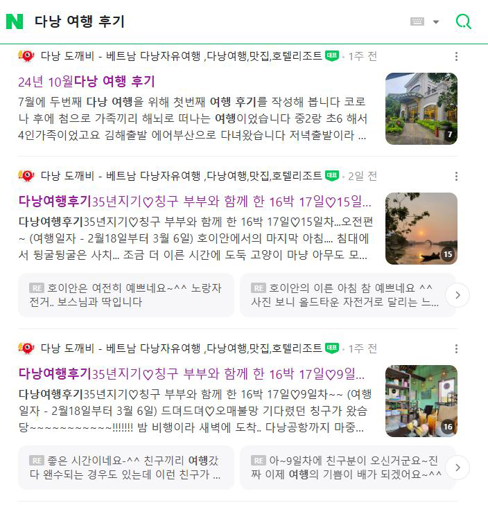 ‘다낭 여행 후기’라는 키워드를 검색하면 한 카페가 도배를 하고 있는데요, 이 글 1위 글부터 분석해 보겠습니다.