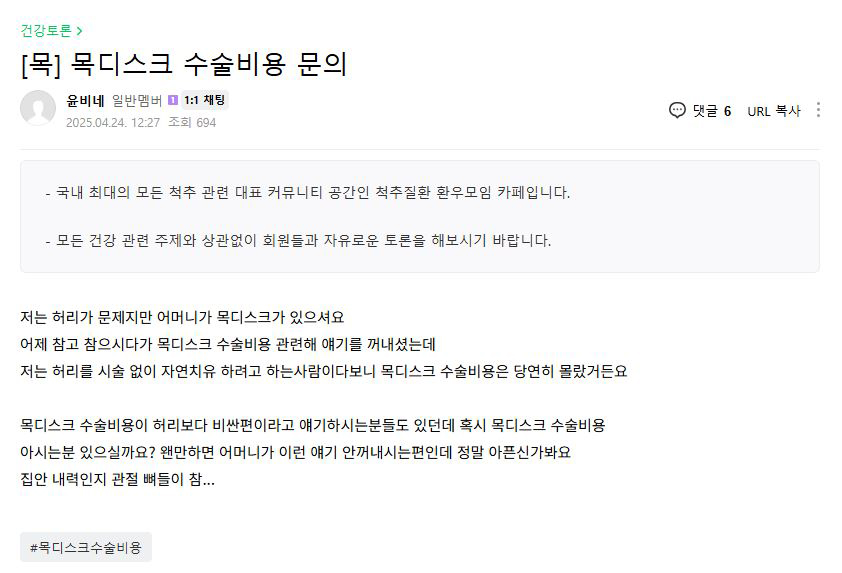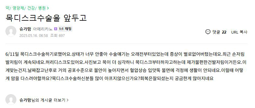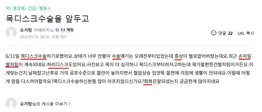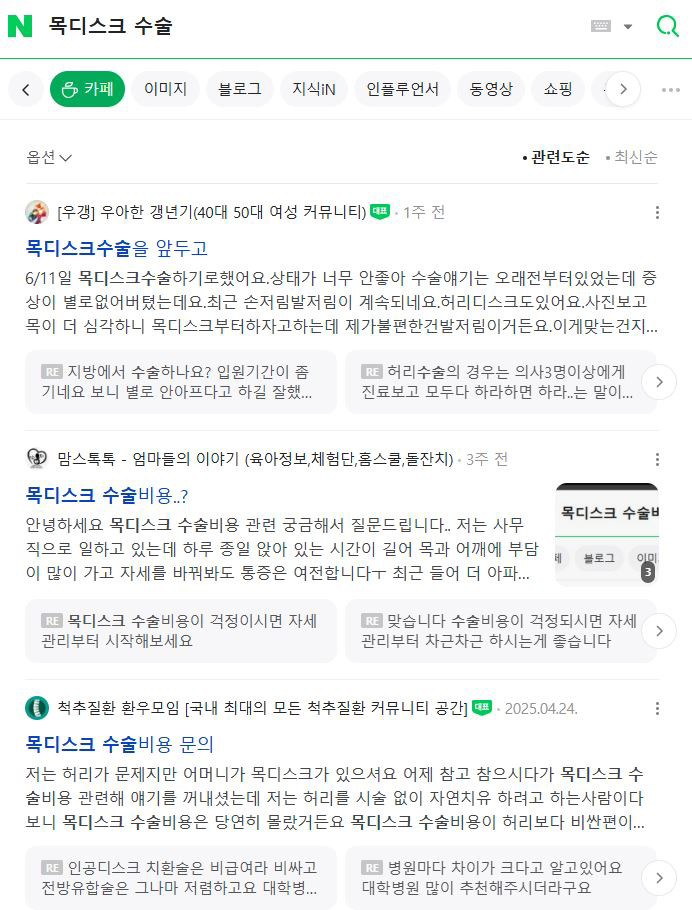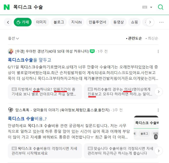 목디스크 수술 검색 후 1위에 나온 카페를 보면 댓글수는 22개, 삽입된 주요 키워드는 수술, 입원기간, 의사, 진료며 이 키워드가 삽입된 댓글이 우선 노출되네요. 이 정도만 파악하시면 댓글 신뢰도에서는 만점을 받으실 수 있습니다.