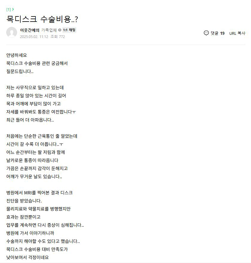 엄청 경쟁력이 쎈 ‘목디스크 수술’이라는 키워드 검색해서 1위부터 보겠습니다.