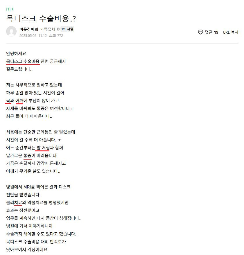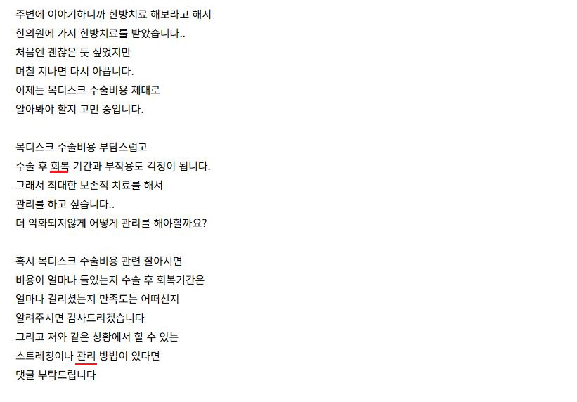 2위 글도 보겠습니다. 2위 글 또한 이와 비슷하게 목디스크 수술비용, 목, 어깨, 팔저림, 통증, 치료, 회복, 관리라는 키워드가 삽입되어 있는 걸 볼 수 있습니다.
