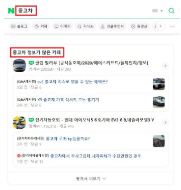 중고차를 검색해도 카페 글을 단독 노출시켜주고 있습니다.