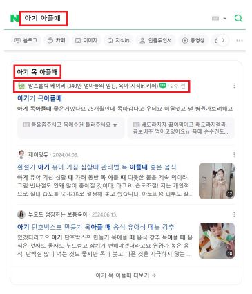 단순 정보성 키워드인 ‘아기 아플때’를 검색해도 ‘아기아플때’라는 키워드 콘텐츠로 블로그와 같이 노출되고 있고