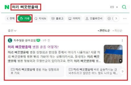 예를 들어 ‘허리 삐끗했을때’라는 키워드를 상위노출 시키고 싶다면 이 척추질환 환우모임이라는 카페 중 자유게시판에 글을 작성해야 하고