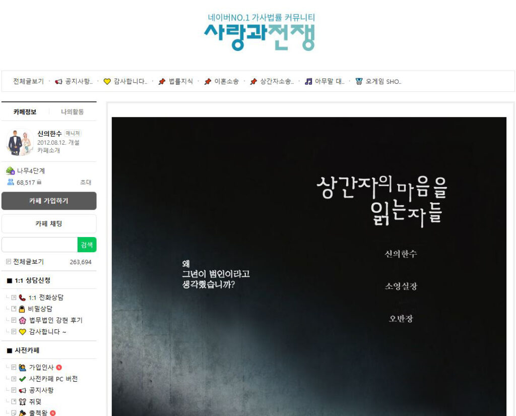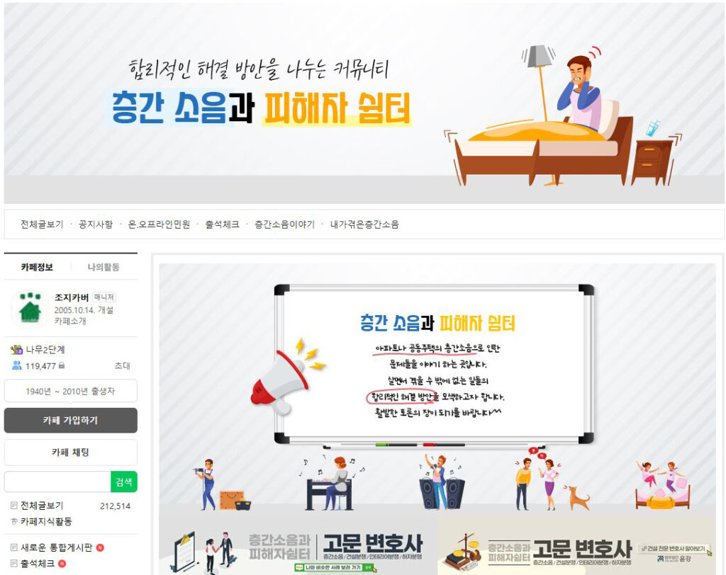 효과 좋은 귀마개 추천, 층간 소음 법적 분쟁 후기, 정신과 상담 기록 공유, 건설사 상대로 소송 이기신 분 계시나요? 등 층간 소음이라는 공통된 문제를 해결하기 위한 온갖 정보와 경험담이 오고 갑니다. 같은 문제를 가지고 있는 사람들이기 때문에 카페가 무섭도록 빠르게 성장하죠.