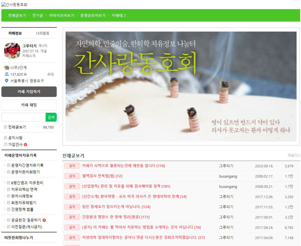 간 질환 카페. 간암, 간염, 지방간 같은 간 질환을 앓고 있는 환우와 그 가족들이 모이는 곳입니다. 단순히 간 질환 얘기만 나오는 게 아닙니다. 여긴 ‘이 영양제 먹어도 되나요?’, ‘수술 후 관리 어떻게 하세요?’, ‘어느 병원 교수님이 명의인가요?’와 같은 생존과 직결된 절박한 정보들이 오고 갑니다.