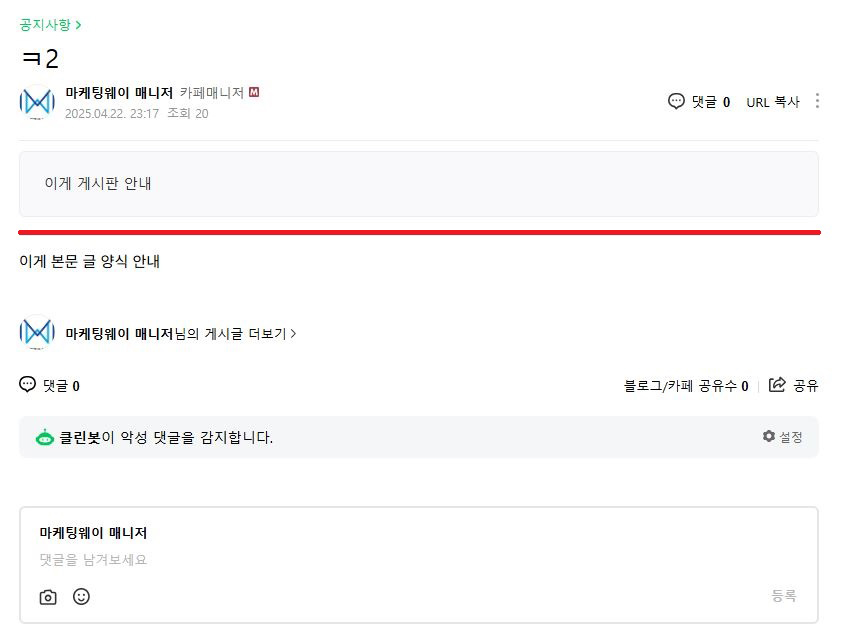 즉, 게시판 안내에는 링크를 달며 내 업체, 이벤트, 카페 가입 유도하는 글을 작성하는 것이 정석이고 본문 글 양식은 회원들이 키워드를 삽입해 제목과 본문을 적을 수 있게 유도해야 합니다.