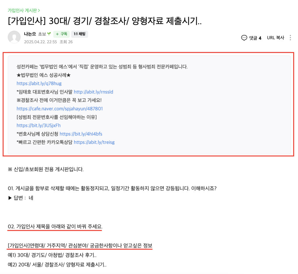 자, 한 법조계 카페입니다. 보시면 게시판 안내에는 본인을 홍보할 수 있는 링크를 걸어놨죠? 그럼 발행되는 모든 글에 자동적으로 내 업체를 홍보하는 홍보 문구가 자동으로 삽입되는 겁니다.