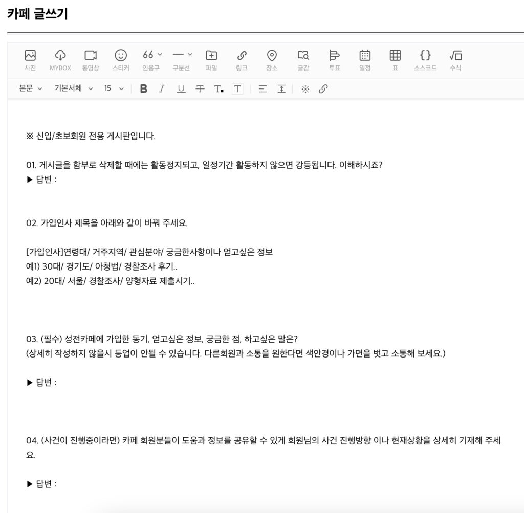 이렇게 자동으로 글 양식이 채워져있는 걸 볼 수 있습니다. 한마디로 글 양식은 글을 작성할 때 내가 쓰든, 카페 회원들이 쓰든 자동적으로 양식이 뜨게 만드는 시스템인 거죠. 이걸 발행하게 되면