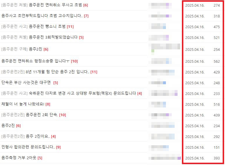 음주운전, 소송, 초범, 3회 적발, 합의, 민형사 등과 같은 키워드가 제목에 포함된 글이 올라오네요. 그것도 하루에 20개씩 이상, 조회수 200은 전부 넘기면서요.