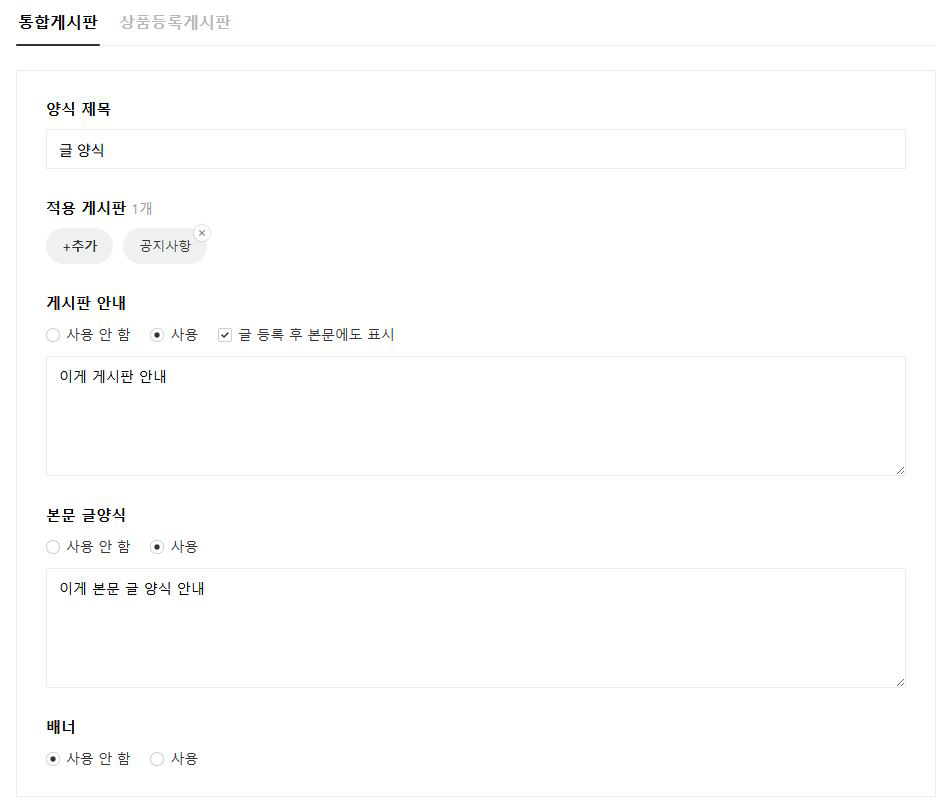 양식 제목은 그냥 ‘글 양식’으로 해놓고 적용 게시판은 공지사항.