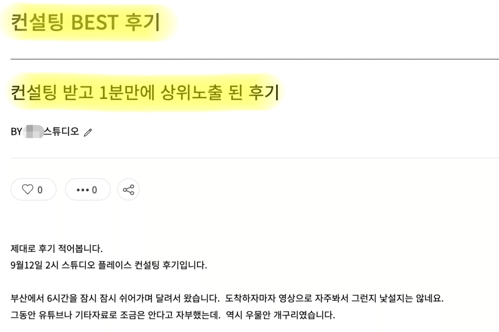 우선 실제 사례를 보여드리겠습니다. 일반인도 제대로 세팅하면 1분 만에 상위 노출이 될 수 있다는 걸 보여주는 실제 후기입니다.