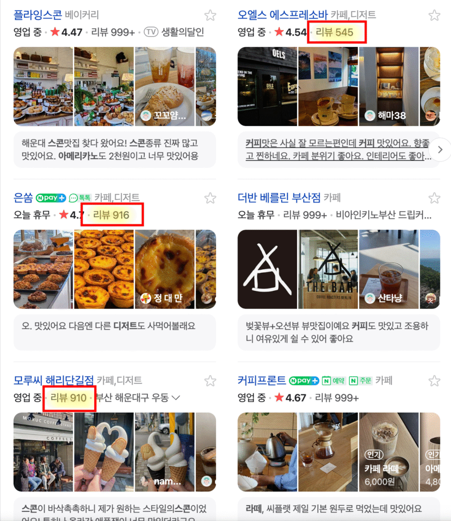 보시면 리뷰 545개 있는 카페가 999개 이상 있는 카페보다 더 상위 노출되어 있고 916개, 910개도 종종 보입니다. 이 뒤에는 999+ 박힌 카페가 수두룩한데도 말이죠.