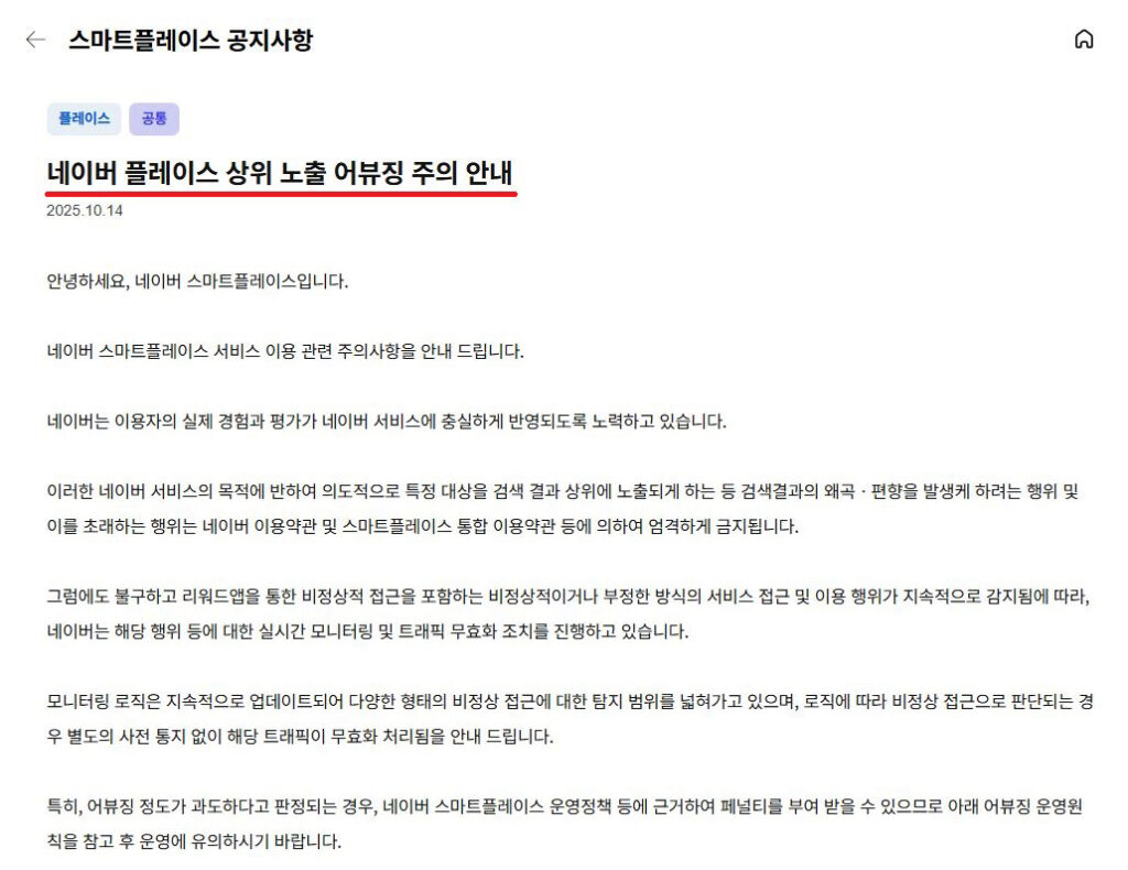자, 이 공지를 보겠습니다. 며칠 전 네이버가 공식적으로 띄운 공지입니다. 제목조차 어마어마하죠? ‘네이버 플레이스 상위 노출 어뷰징 주의 안내’