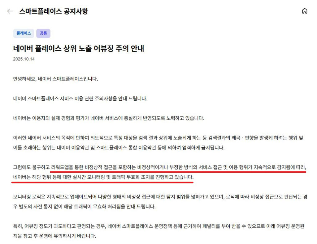 첫 번째 중요한 문장입니다. ‘리워드 앱을 통한 비정상적 접근을 포함하는 비정상적이거나 부정한 방식의 서비스 접근 및 이용행위가 지속적으로 감지됨에 따라, 네이버는 해당 행위 등에 대한 실시간 모니터링 및 트래픽 무효화 조치를 진행하고 있습니다’