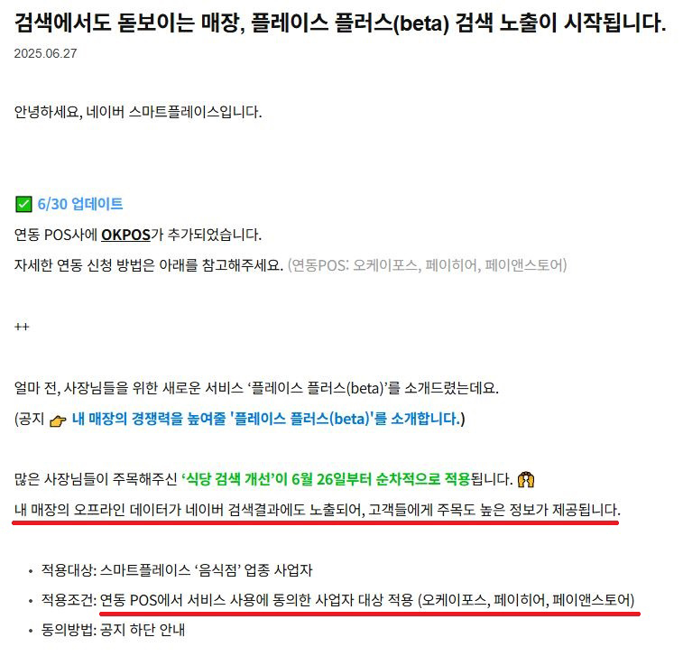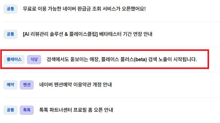 6월 27일에 이런 공지가 올라왔습니다. 제목 – 검색에서도 돋보이는 매장, 플레이스 플러스 검색 노출이 시작됩니다.