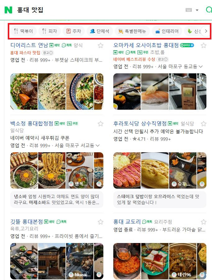 플레이스 영역 보면 이런 필터가 보이시죠? 새로오픈, 뷰맛집, 인테리어, 사진 맛집 등과 같은 키워드들이 보이네요. 숙박 업종뿐만 아니라