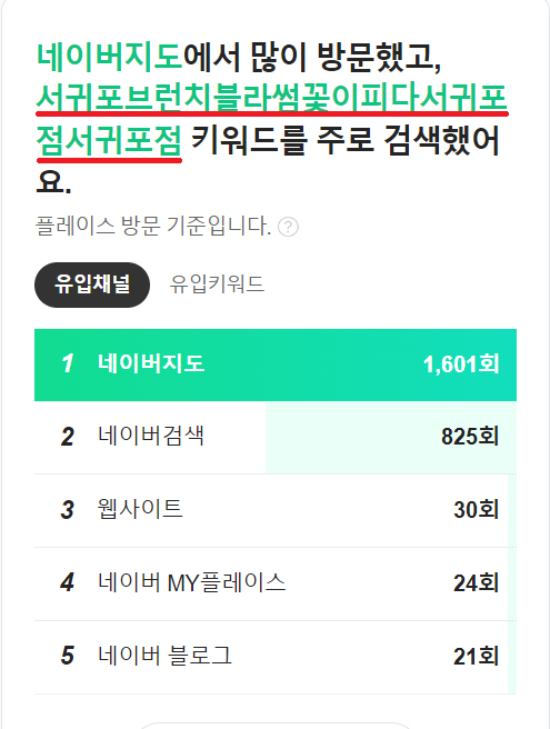 이 분도 마찬가지죠? 가장 많이 들어온 키워드가 ‘서귀포브런치블라썸꽃이피다 서귀포점서귀포점’이라는 키워드로 주로 검색해서 방문했다고 나오네요.