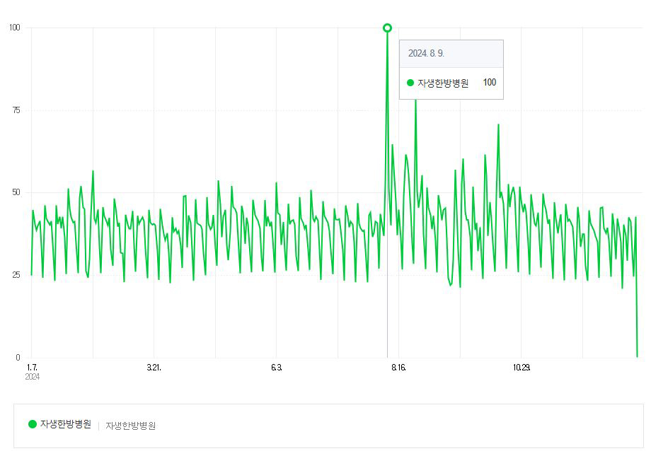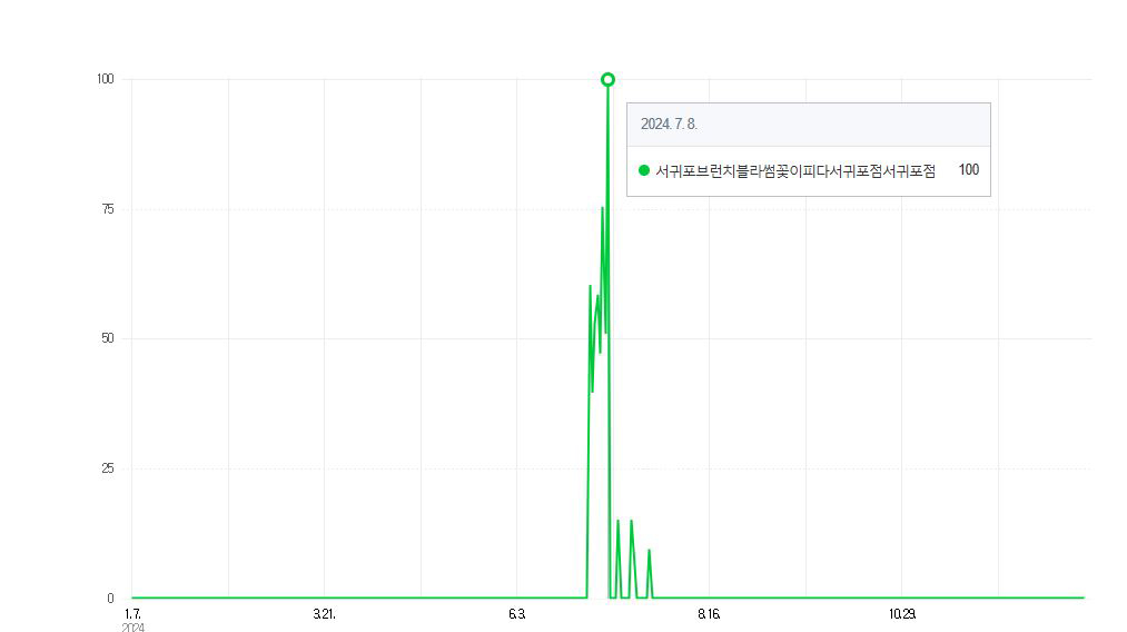 이전까지는 0. 아예 제로였다가 7월 초부터 갑자기 급상승하기 시작, 7월 8일에 100% 맥스를 찍고 7월 말에 점차 줄어들고 있죠? 그리고 다시 제로. 이게 바로 허위 키워드입니다.