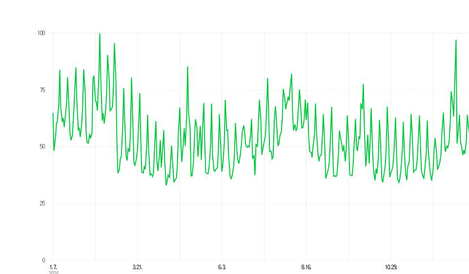 이렇게 100 맥스를 찍더라도 그전에 어느 정도의 검색량이 있어야 정상적인 키워드 검색 활동이라 볼 수 있습니다.