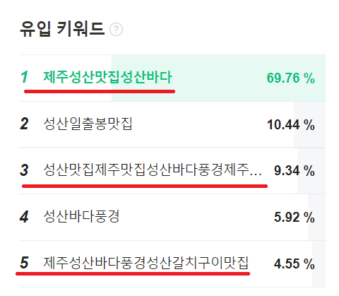 자, 이분도 마찬가지입니다. 보시면 ‘제주성산맛집성산바다’라는 키워드, ‘성산맛집제주맛집성산바다풍경제주’, ‘제주성산바다풍경성산갈치구이맛집’이라는 키워드 등으로 들어오고 있는데 이 키워드로 검색할 소비자가 단 한 명이라도 있을까요?