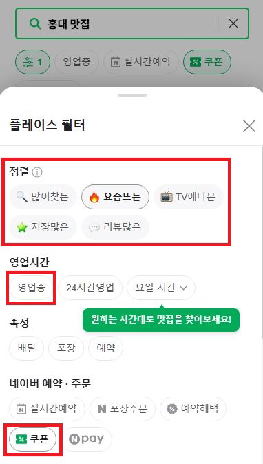 홍대 맛집을 검색해 플레이스 필터를 통해 본인들의 시간을 효율적으로 쓰려고 합니다. 많이찾는, 요즘뜨는, 리뷰많은 등과 같은 필터를 쓰기도 하고 지금 영업 중인지, 쿠폰이 제공되는 업체인지 전부 필터링해 꼼꼼하게 업체를 선정하죠.