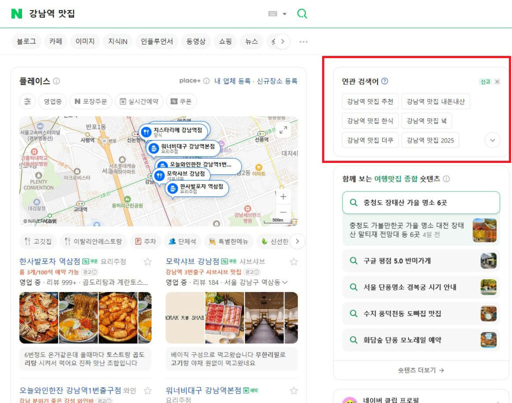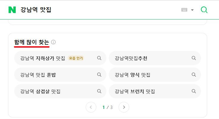 자동완성어가 검색 시작 단계의 키워드라면, 연관 검색어는 검색 확장 단계의 키워드입니다. 강남역 맛집을 검색한 사람들이 그다음으로 궁금해하는 것들을 보여주는 키워드 영역이거든요. 이 키워드들을 분석, 추출하시는 겁니다.