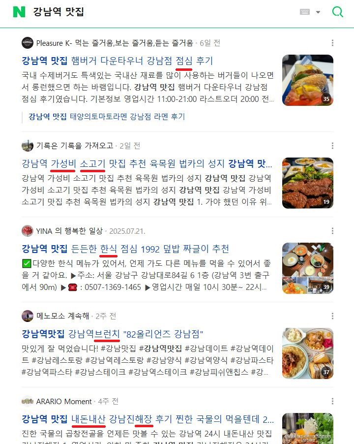 예를 들면 강남역 맛집 검색 시 이런 블로그들 제목이 나오죠? 보시면 점심, 가성비, 소고기, 한식, 브런치, 내돈내산, 해장 등의 키워드들이 나옵니다. 이런 키워드들을 추출하시는 겁니다.