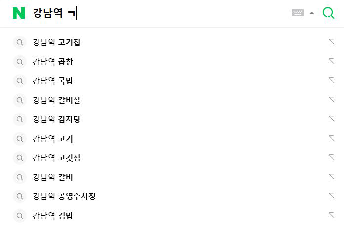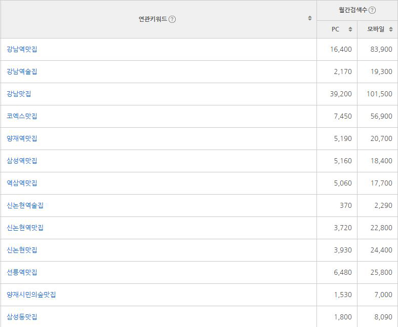 예를 들어 ‘강남역 맛집’을 검색하면 이런 식으로 이 키워드와 관련된 다른 키워드들을 볼 수 있죠. 여기서 키워드를 추출하는 겁니다.