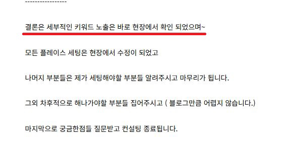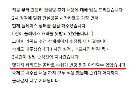 지금 보시는 이 후기들은 실제 제 플레이스 컨설팅을 받으신 분들의 후기입니다. 이분들 모두 저와 컨설팅을 진행하고 있는 도중에, 그날! 단지 대표 키워드 세팅만 제대로 했을 뿐인데 즉각적으로 순위가 변동되거나 노출이 시작되는 경험을 하셨습니다.