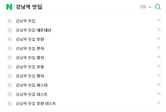 네이버 검색창에 내 핵심 키워드, 예를 들어 ‘강남역 맛집’을 쳤을 때 자동으로 따라붙는 키워드를 말합니다. 이 자동완성은 ‘현재’ 사람들이 가장 많이 검색하는 조합을 실시간으로 보여줍니다.