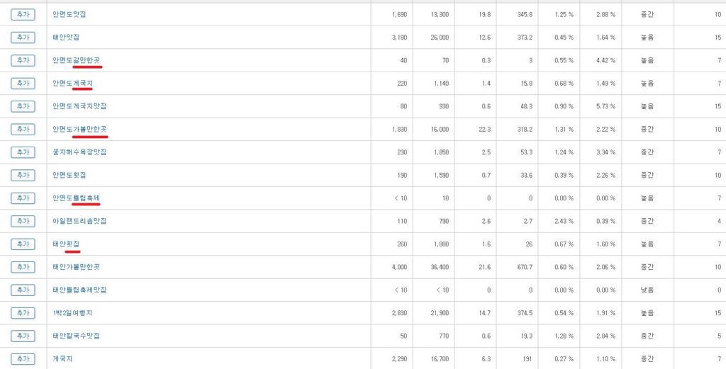 이런 데이터가 있다면 3월부터는 안면도 튤립축제 맛집이라는 대표 키워드를 설정해놓고 5월 말부터 다른 시즌 키워드를 찾아 변경해 주는 겁니다.