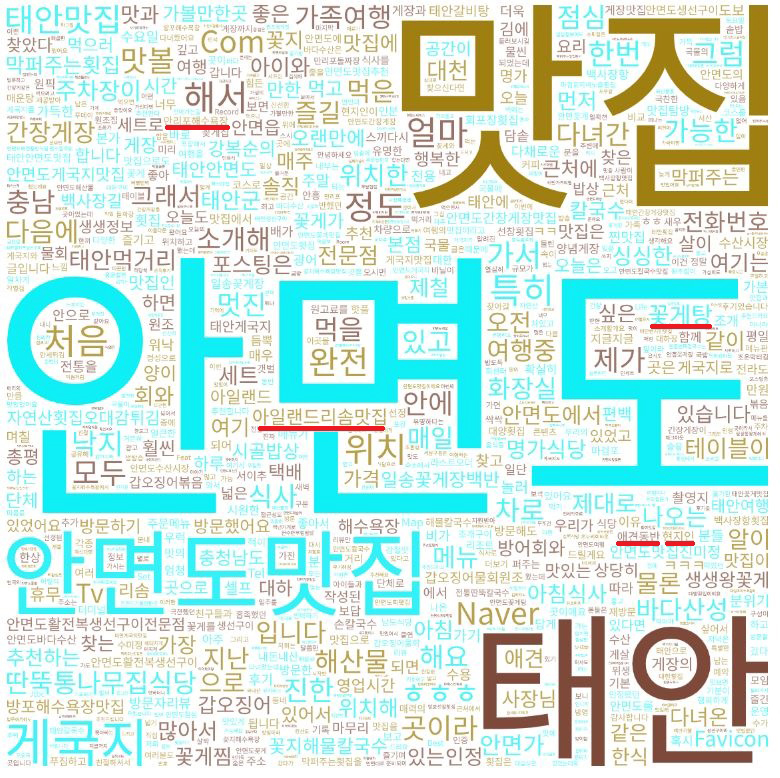 예를 들어 ‘안면도 맛집’이라는 데이터를 텍스트 마이닝 한다면 이런 데이터가 나오는데 이 데이터를 보면 네이버 트렌드, 블로그, 카페, 네이버 광고주 시스템에 있던 키워드가 다 추출되는 것은 물론 우리가 찾지 못했던 데이터까지 추출되는 걸 볼 수 있습니다.