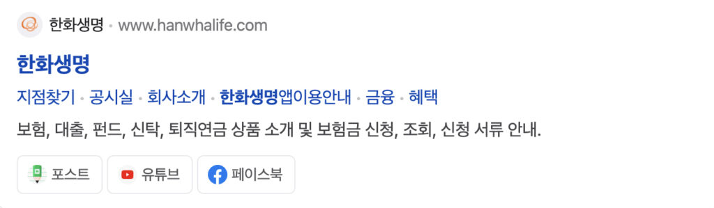 예를 들어 한화생명을 검색하면 홈페이지가 나오고 이 홈페이지에 어떤 정보가 있는지 나오게 됩니다.