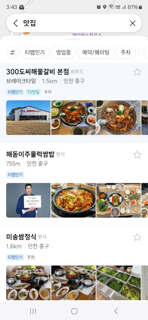 자 이건 T맵에서 검색 시 나오는 맛집 리스트입니다. 대표적으로 GPS로 움직이는 티맵이 지금 거리 순으로 나오고 있나요? 아니죠?