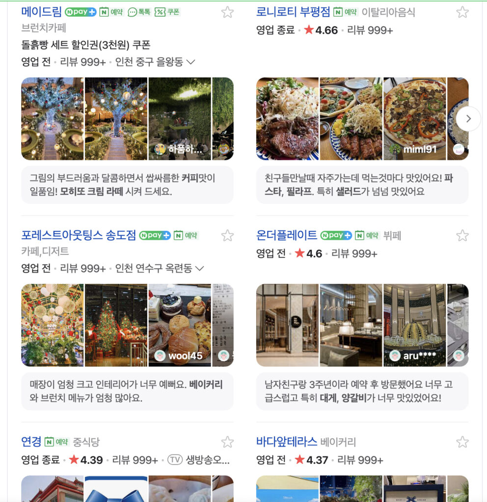 이 순위는 네이버에 내 근처 맛집을 검색했을 때 상위 노출된 업체들입니다. 메이드림이 첫 번째이며 이곳부터 순서대로 인천 을왕동, 인천 부평, 인천 연수, 인천 운서동, 인천 차이나타운, 인천 구읍뱃터입니다.