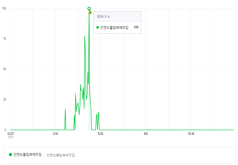 ‘안면도 튤립축제 맛집’이라는 키워드를 검색해 보니 3월 10일 후로 검색량이 조금씩 생기다가 5월 4일에 정점을 찍고 5월 말부터 검색량이 현저히 떨어지는 걸 볼 수 있습니다.