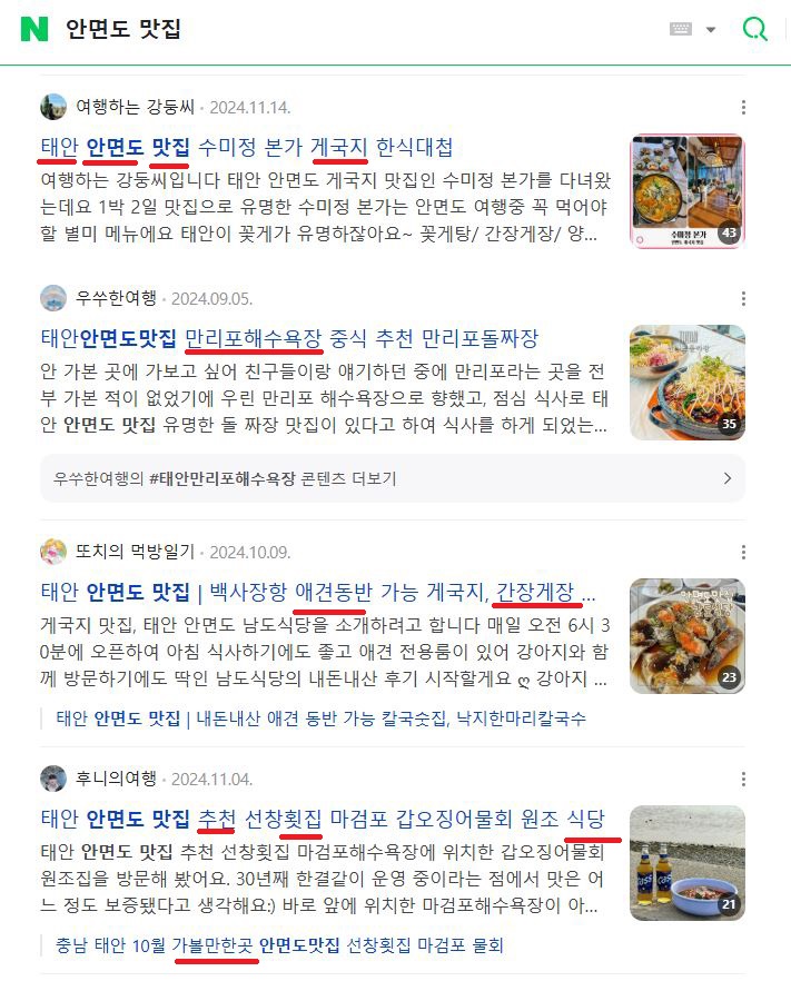 자 네이버에 안면도 맛집을 검색한 후 블로그 탭에 들어온 검색 결과입니다. 여기에 전부 키워드가 나와있죠?