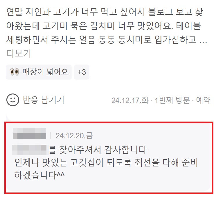 3. 리뷰 내용에 대한 감사함, 재방문시 더욱더 만족스럽게 해주겠다는 식의 멘트 삽입