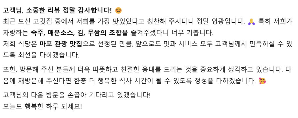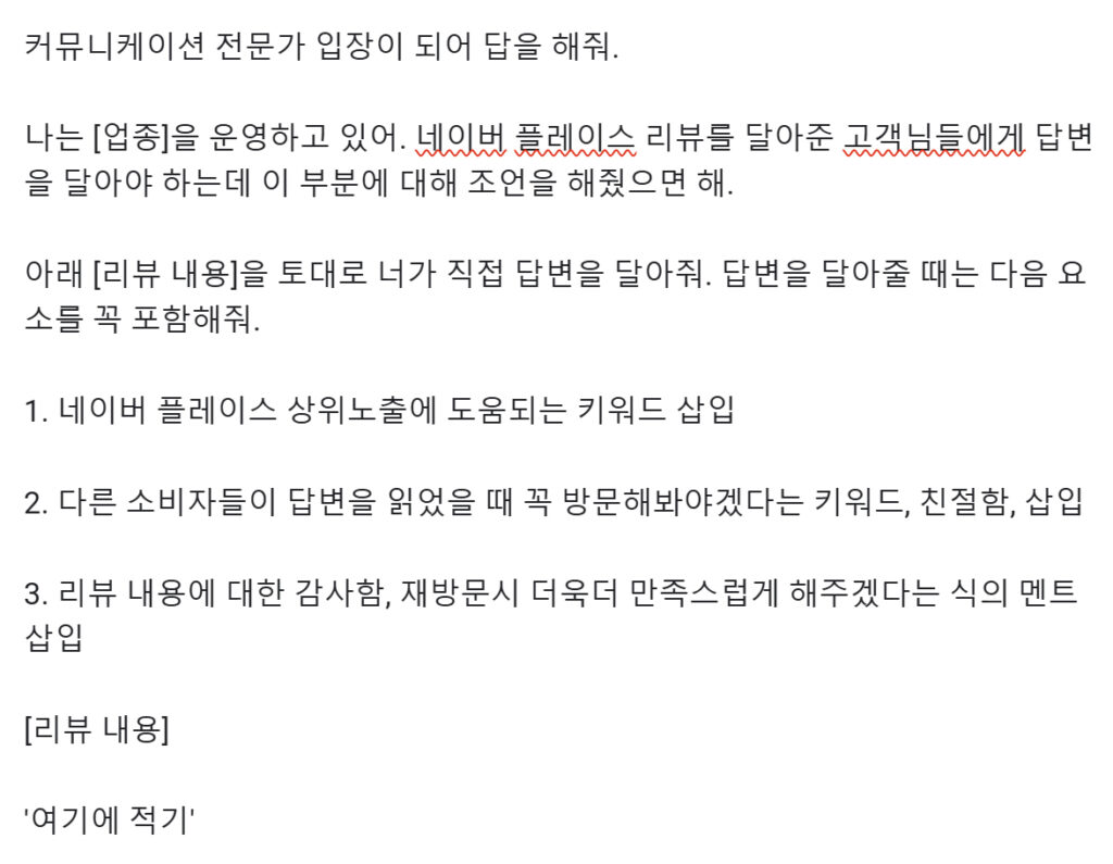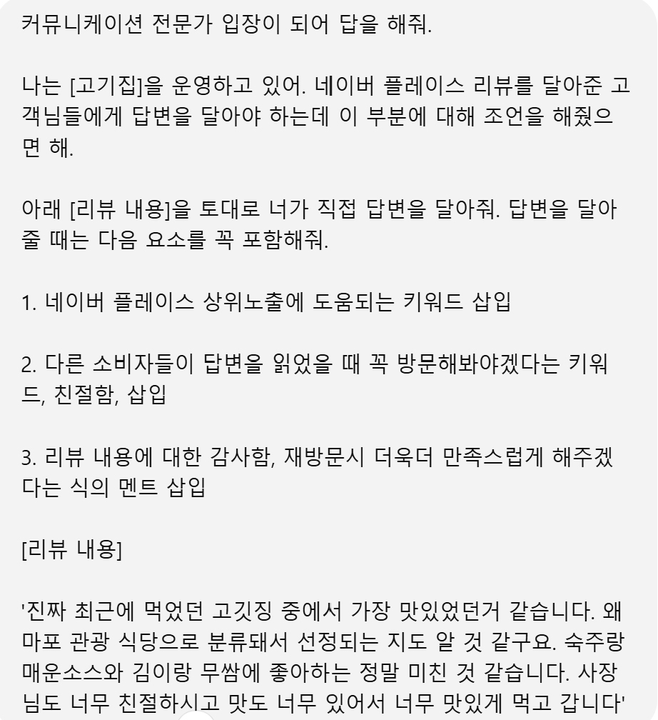 그리고 여기서 하나 더 팁. 제가 지금 알려드린 건 플레이스 리뷰 답글이지만 활용도에 따라 어디에서나 쓸 수 있는 거 느끼셨죠? 배민 답글로 활용할 수도 있고 네이버 예약 메세지로도 활용할 수 있습니다. 이 활용법은 무궁무진하니 제가 드린 프롬프트를 이용해 답글 스트레스 날리시길 바랍니다.