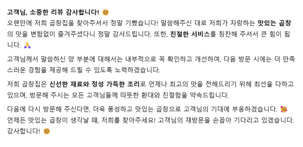 부정적인 리뷰도 아주 아름답게 대처하는 답글을 만들어냈습니다. 이 생성된 답변을 그대로 쓰는 것보다는 내 말투나 가게 성격에 맞게 수정해서 쓴다면 훨씬 더 자연스러운 리뷰 답글이 될 겁니다.