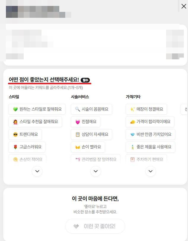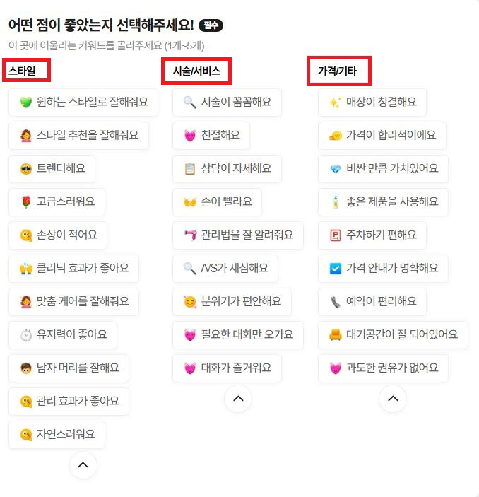 바로 이 화면이죠. ‘어떤 점이 좋았는지 선택해주세요!’라고 하며 여러 가지 키워드를 ‘선택’할 수 있게 합니다. 이게 바로 선택 키워드입니다.