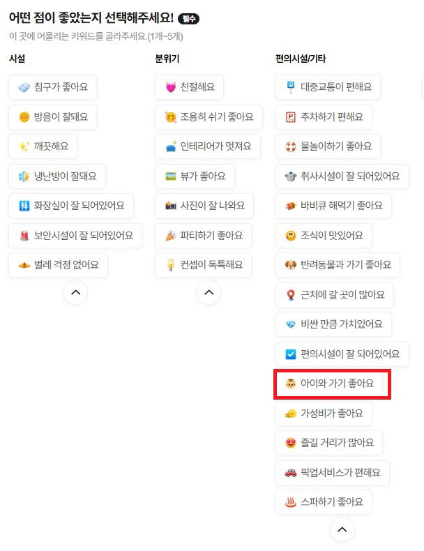 선택 키워드를 보면 ‘아이와 가기 좋아요’라는 항목이 있고 여기에 동일한 이모티콘이 있습니다. 숙소뿐일까요? 아닙니다.